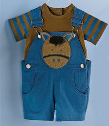 Set includes blue shortall with applique horse face on front, and sporty sleeve stripe tee.