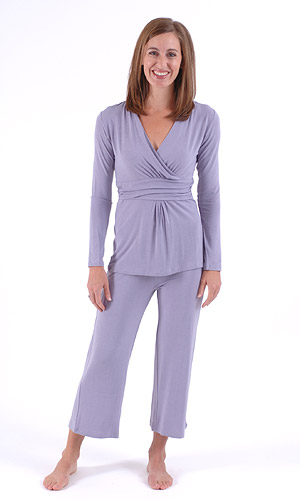 This organic maternity clothing is our Kate pajama set with cropped pants and a stylish top. An amazingly comfortable fit for expecting moms. The cropped pant fits comfortably over or under mama's belly.