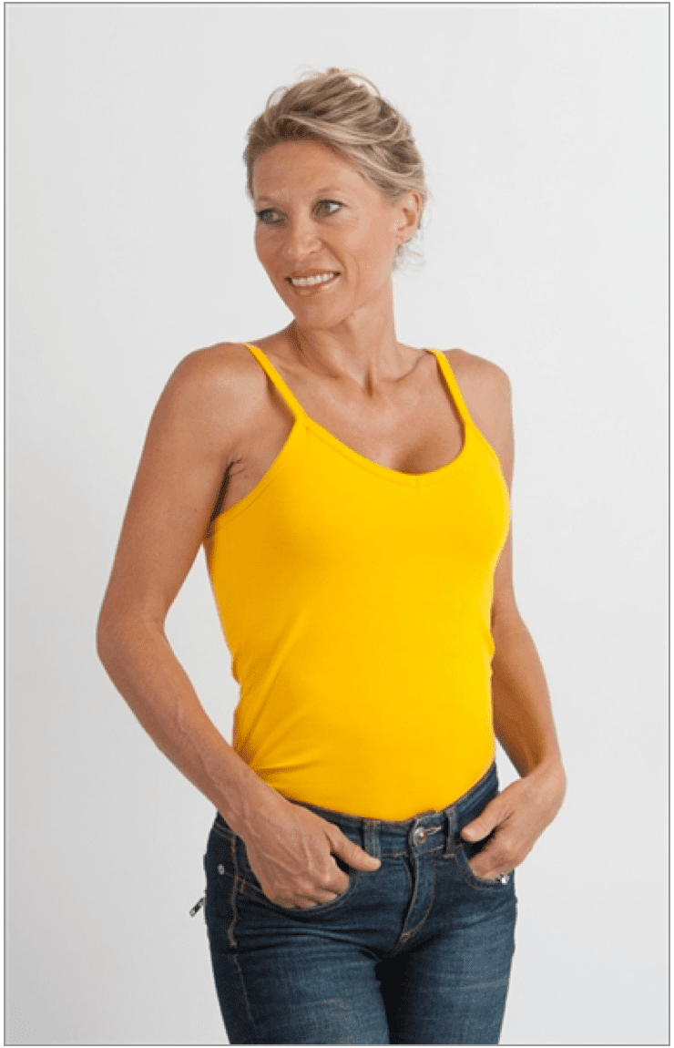 Our newest camisole comes in marigold, fuscia, pale pink, cream and black. Made of 70% viscose from organic bamboo, 20% organic cotton, and 10% spandex.