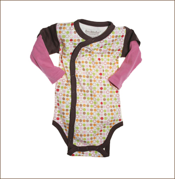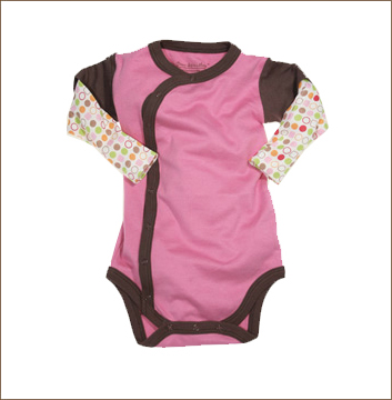 The Bamboo Baby Kimono Bodysuit for infant girls has stitch-in contrasting layered sleeves and features snaps on the front and crotch for easy diaper change.