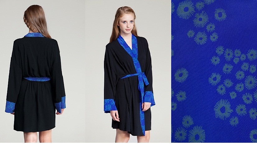 It is a stylish, functional and fun robe made with incredibly soft bamboo jersey paired with patterned silk for fun pops of color