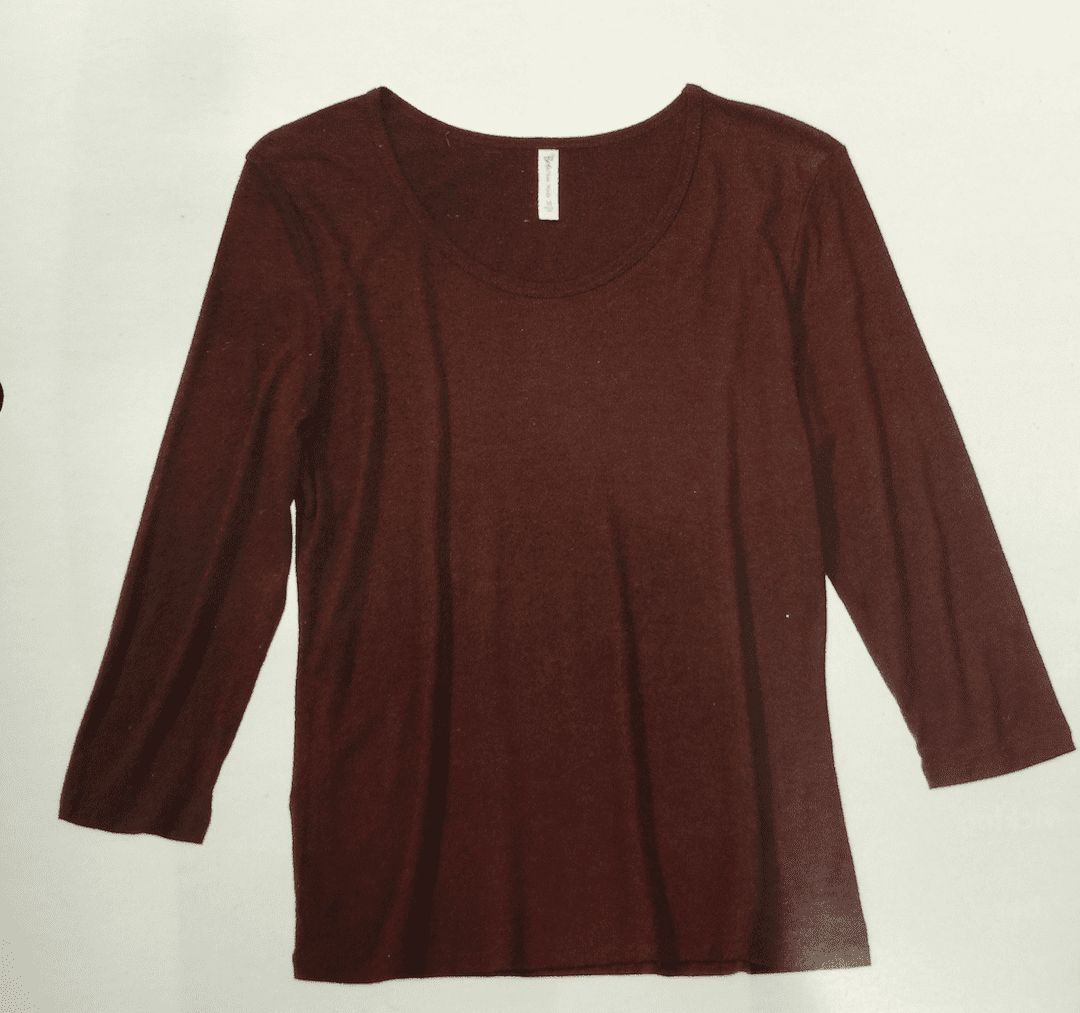 This shirt is made from 70% bamboo viscose, 30% cotton sheer jersey. It comes in three styles, V-neck short sleeve, crew neck short sleeve and scoop neck 3/4 sleeve.