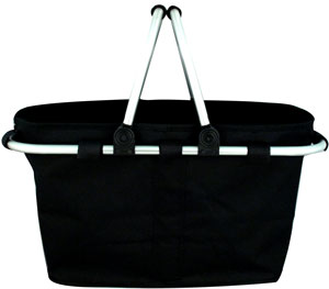 This collapsible or foldable shopping or market basket has a very light aluminum frame. The basket carrier is made from durable but light in weight water proofed fabric and has nylon footings at the bottom. The basket carrier fabric is finished on both sides, inside and outside.