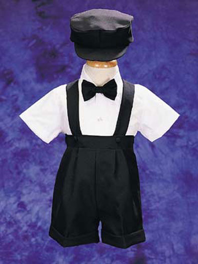 It has Cuffed shorts with matching suspenders, bowtie and cap.