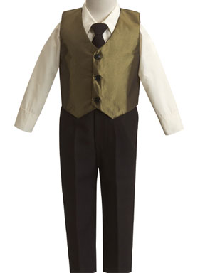 Four piece set includes ivory button front dress shirt, black tie, black slacks, and matching button front taffeta vest.