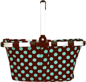 This collapsible or foldable shopping or market basket has a very light aluminum frame. The basket carrier is made from durable but light in weight water proofed fabric and has nylon footings at the bottom. The basket carrier fabric is finished on both sides, inside and outside.