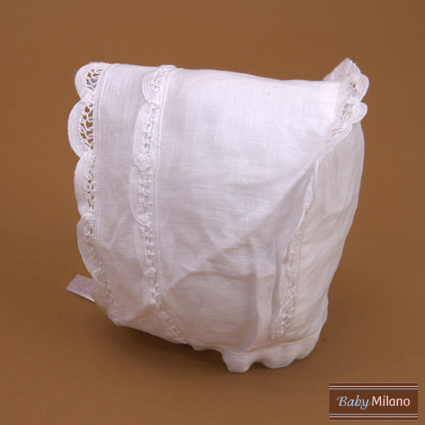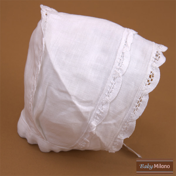The 100 % cotton Christening Bonnet is soft, white and detailed with lace around the front and back of the bonnet, and satin ribbons tie it in the front.