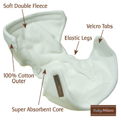 The diapers are made with 100% cotton, double fleece and an ultra thin absorbent core which gives the diaper a trim fit.