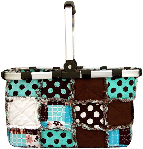 This quilted patchwork collapsible or foldable shopping or market basket has a very light aluminum frame. The basket carrier fabric is quilted on both sides and has nylon footings at the bottom.