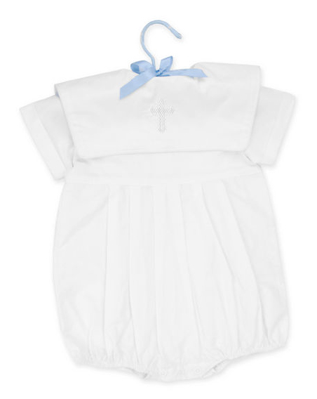 This cute and elegant baby boy's christening romper has square collar with embroidered cross.
