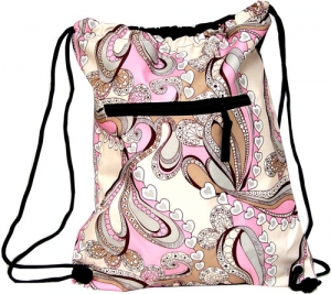 This backpack has MICROFIBER CONSTRUCTION with DRAWSTRING/SHOULDER STRAP CLOSURE and OUTSIDE FRONT ZIP POCKET.