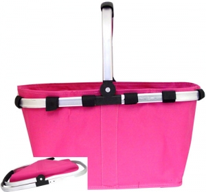 This collapsible or foldable shopping or market basket has a very light aluminum frame. The basket carrier is made from durable but light in weight water proofed fabric and has nylon footings at the bottom. The basket carrier fabric is finished on both sides, inside and outside.