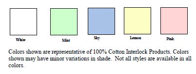 Five colors for you to choose from. Click on the color icon and you will have a larger color palate to look at. Please note Colors shown are approximations, because of variations in the way monitors show color swatches may not match actual garment colors.