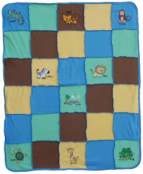 This adorable patchwork blanket is adorned with Jungle animals and scenes.