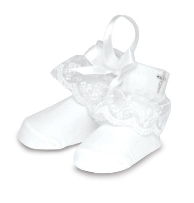 Pretty little sock booties have embroidered silver cross on lacey cuff.