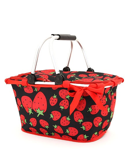 This collapsible strawberry print color market shopping basket has rubber-cushioned handle and removable support stabilizer on each side. The basket may be flattened for space saver storage. It also has a zipper top with removable ribbon around the the top of the frame.