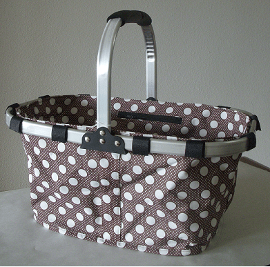 This collapsible or foldable shopping or market basket has a very light aluminum frame. The basket carrier is made from durable but light in weight water proofed fabric and has nylon-based footings at the bottom. The basket carrier fabric is finished on both sides, inside and outside.