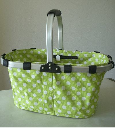 This collapsible or foldable shopping or market basket has a very light aluminum frame. The basket carrier is made from durable but light in weight water proofed fabric and has nylon-based footings at the bottom. The basket carrier fabric is finished on both sides, inside and outside.