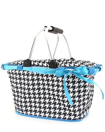 This collapsible houndstooth print with blue trim market shopping basket has rubber-cushioned handle and removable support stabilizer on each side. The basket may be flattened for space saver storage. It also has a zipper top with removable ribbon around the the top of the frame.