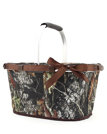 This collapsible mossy oak print market shopping basket has rubber-cushioned handle and removable support stabilizer on each side. The basket may be flattened and folded into half its size for space saver storage. It has zipper closure. It comes with brown trim and matching removal ribbon.