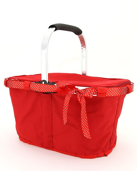 This collapsible solid color market shopping basket has rubber-cushioned handle and removable support stabilizer on each side. The basket may be flattened and folded into half its size for space saver storage. It has zipper closure. It comes with matching trim and removal accent ribbon.