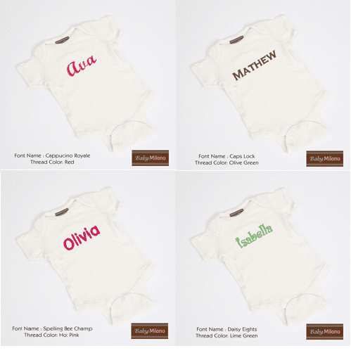 We have picked out some suggested fonts for the Personalized Organic Baby Onesie with Name by Baby Milano (see pictures above), however, if none of these tickle your fancy see our entire font collection. We have also picked out some of the most popular thread colors for as well, but feel free to pick an alternate color if you wish!