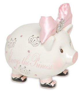 is an adorable piggy bank from the Mud Pie princess line --keepsake piggy banks.