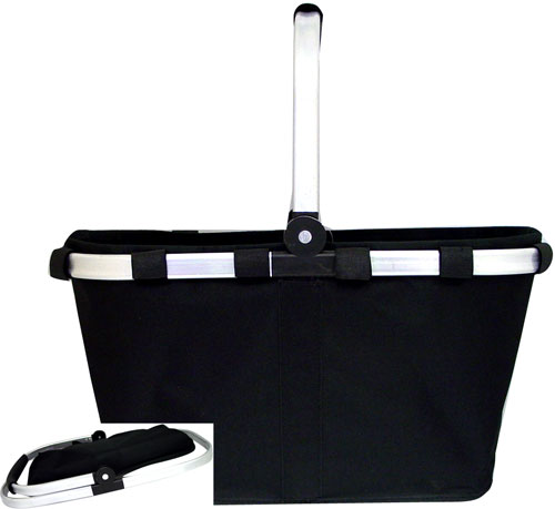 This collapsible or foldable shopping or market basket has a very light aluminum frame. The basket carrier is made from durable but light in weight water proofed fabric and has nylon-based footings at the bottom. The basket carrier fabric is finished on both sides, inside and outside.