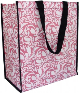 Eco-Green Reusable Market Tote in Pink and White Damask Design