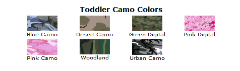 We have many camouflage color to choose from. Click on the color icon and you will have a larger color palate to look at. Please note Colors shown are approximations, because of variations in the way monitors show color swatches may not match actual garment colors.
