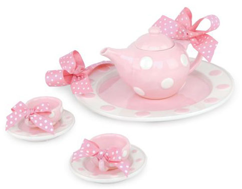 This cute polka dots Ceramic 6-piece tea set includes 1 teapot, 1 serving tray, 2 cups and 2 saucers.