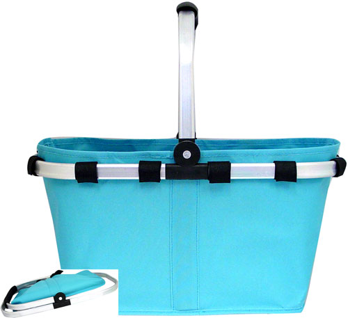 This collapsible or foldable shopping or market basket has a very light aluminum frame. The basket carrier is made from durable but light in weight water proofed fabric and has nylon footings at the bottom. The basket carrier fabric is finished on both sides, inside and outside.